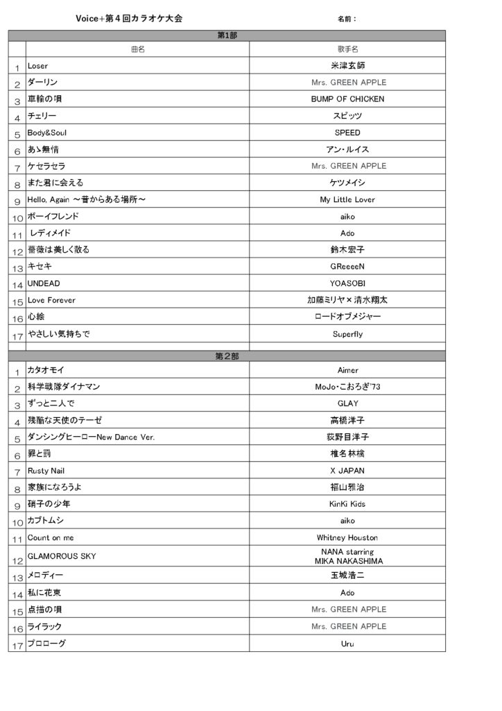 第4回カラオケ大会曲目一覧 2025 6/30 発表会 2025年6月30日 発表会 カラオケ よかったらシェアしてね! URLをコピーしました! URLをコピーしました! 第4回カラオケ大会でした! めぐみ先生レッスン受付開始! この記事を書いた人 voiceplus 関連記事 カラオケ勉強会開催決定! 2025年12月9日 昨日は発表会でした! 2025年11月17日 いよいよ発表会です! 2025年11月14日 生徒さんリハーサルでした! 2025年11月4日 7時間バンドリハーサルでした! 2025年10月27日 発表会フライヤー 2025年10月22日 バンドリハスタート! 2025年10月5日 発表会参加募集開始! 2025年7月25日 コメント コメントする コメントをキャンセルコメント ※ 名前 ※ メール ※ サイト 次回のコメントで使用するためブラウザーに自分の名前、メールアドレス、サイトを保存する。