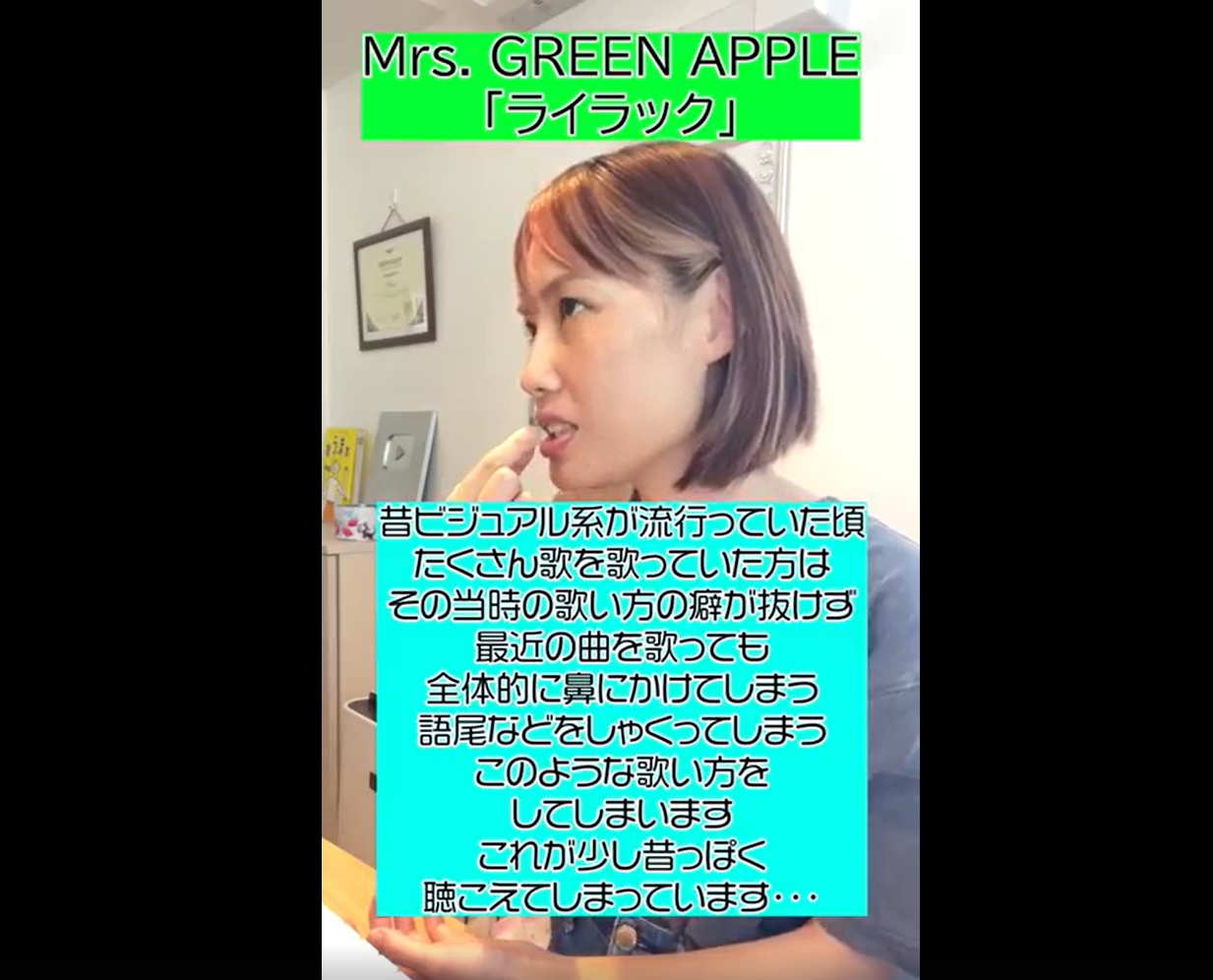 【レッスン動画】ライラック – Mrs.GREEN APPLE 2025 9/12 YouTube レッスン紹介 生徒さん 2025年9月12日 Mrs.GREEN APPLE を今っぽく歌うにはどうする? YouTube レッスン紹介 生徒さん youtube カラオケ ボイストレーニング ボイトレ 歌い方 よかったらシェアしてね! URLをコピーしました! URLをコピーしました! 【レッスン動画】恋音と雨空-AAA レッスン動画】Soranji-Mrs.GREEN APPLE この記事を書いた人 voiceplus 関連記事 【レッスン動画】「DON’T STOP ME NOW」QUEEN 2026年1月14日 【レッスン動画】「幾億光年」Omoinotake 2026年1月5日 【レッスン動画】 Mrs. GREEN APPLEの「クスシキ」② 2026年1月5日 【レッスン動画】Mrs. GREEN APPLE「クスシキ」① 2026年1月5日 【レッスン動画】Mrs. GREEN APPLE「GOOD DAY」 2026年1月5日 謹賀新年 2026年1月5日 12月いくちゃんねる動画 2025年12月28日 【母と娘】笑ったり転んだり-ハンバートハンバート【歌ってみた】 2025年12月27日 コメント コメントする コメントをキャンセルコメント ※ 名前 ※ メール ※ サイト 次回のコメントで使用するためブラウザーに自分の名前、メールアドレス、サイトを保存する。